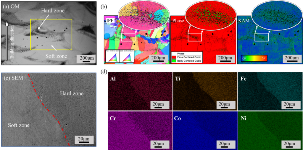 1. **Трехмерное пространственное проектирование структуры:** Благодаря тщательному планированию траектории осаждения нам удалось обеспечить чередующееся нанесение сплава CoCrNi с гранецентрированной кубической (ГЦК) решеткой — отличающегося превосходной пластичностью («мягкая зона») — и сплава CoCrNiAl0.6TiFe с объемно-центрированной кубической (ОЦК) решеткой, характеризующегося высокой прочностью («твердая зона»). В результате этого процесса было реализовано чередующееся распределение «мягких» и «твердых» областей в трехмерном пространстве (Рис. 1), а не просто создание простой двумерной слоистой или градиентной структуры.