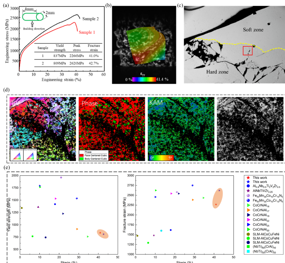 2. **Синергетическое превосходство эксплуатационных характеристик:** Данная инновационная структура позволила успешно преодолеть традиционную дилемму «компромисса» между прочностью и пластичностью материала. Свойства полученного материала продемонстрировали исключительное сочетание прочности и вязкости: был достигнут предел текучести >800 МПа, предел прочности при разрыве >2200 МПа и относительное удлинение при разрыве >40% (Рис. 2) — показатели, превосходящие значения, описанные в литературе для множества других высокоэнтропийных сплавов.