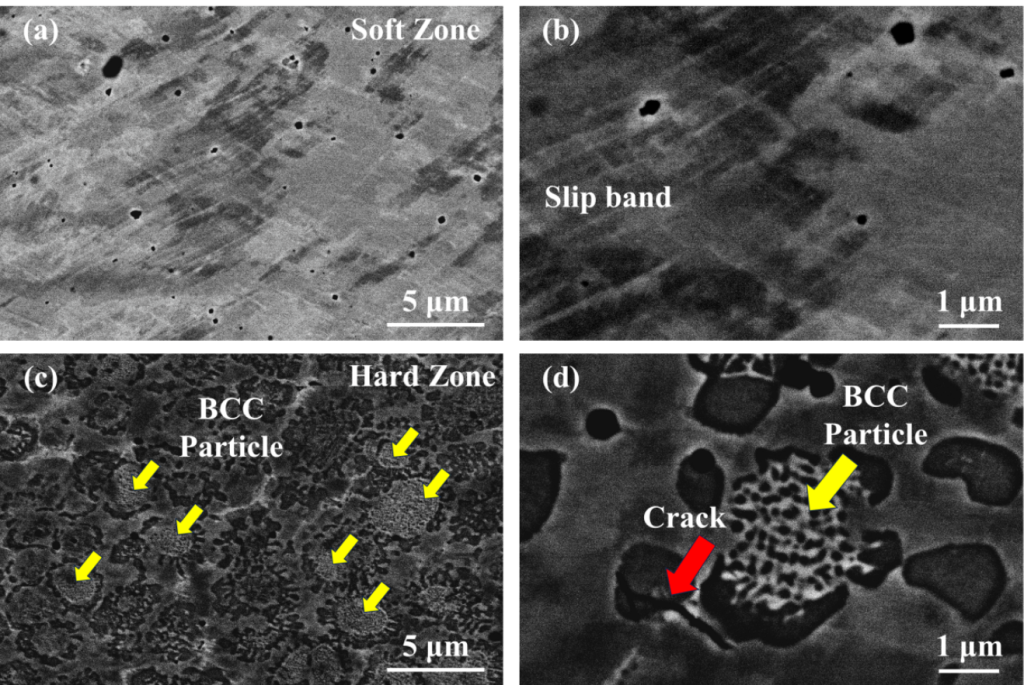 3. **Глубокое механистическое обоснование:** Исследование показало, что исключительные эксплуатационные характеристики материала обусловлены синергетическим взаимодействием между гетерогенным деформационным упрочнением и накоплением геометрически необходимых дислокаций на границах раздела фаз. Более того, частицы ОЦК-фазы в пределах «твердых зон» эффективно препятствуют распространению трещин и отклоняют их траекторию, в то время как ГЦК-фаза в «мягких зонах» обеспечивает возможность значительной пластической деформации; совместное действие этих двух фаз синергетически замедляет наступление разрушения материала (Рис. 3).