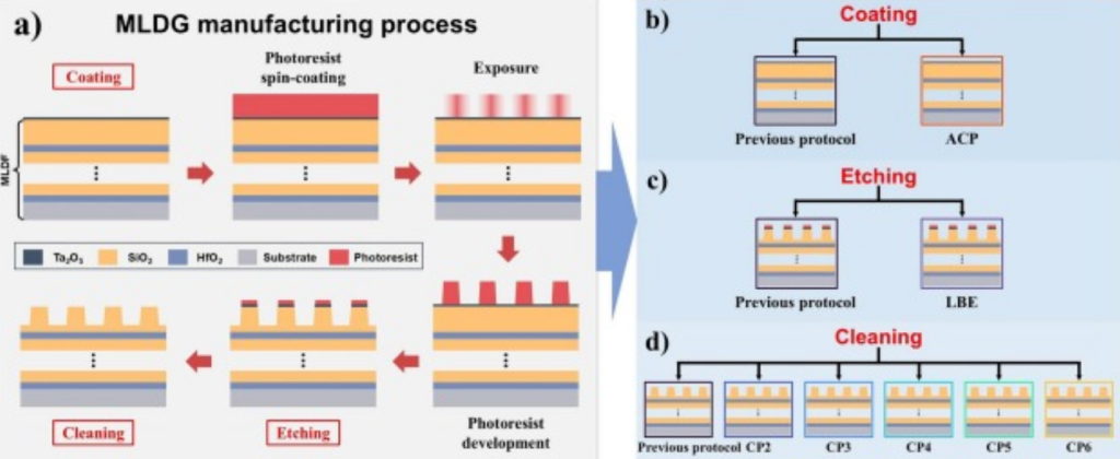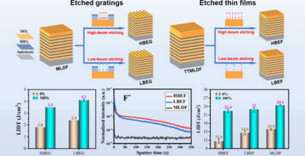 Что касается дифракционных решеток для сжатия импульсов, исследователи раскрыли механизм влияния процесса реактивно-ионного травления (RIE) на стойкость решетки к повреждениям. Они обнаружили, что процесс травления высокоэнергетическим ионным пучком — в котором используются фторсодержащие газы — приводит к проникновению фторсодержащих загрязнений в верхний диэлектрический слой решетки, создавая дефекты-предшественники, распространяющиеся на глубину до нескольких сотен нанометров. Оптимизировав процесс травления с целью минимизации внедрения фторсодержащих загрязнений, исследователи успешно повысили пороги повреждения в пикосекундном диапазоне (~10 пс) как для диэлектрической пленки решетки, так и для самой решетки в целом — на 26% и 33% соответственно.